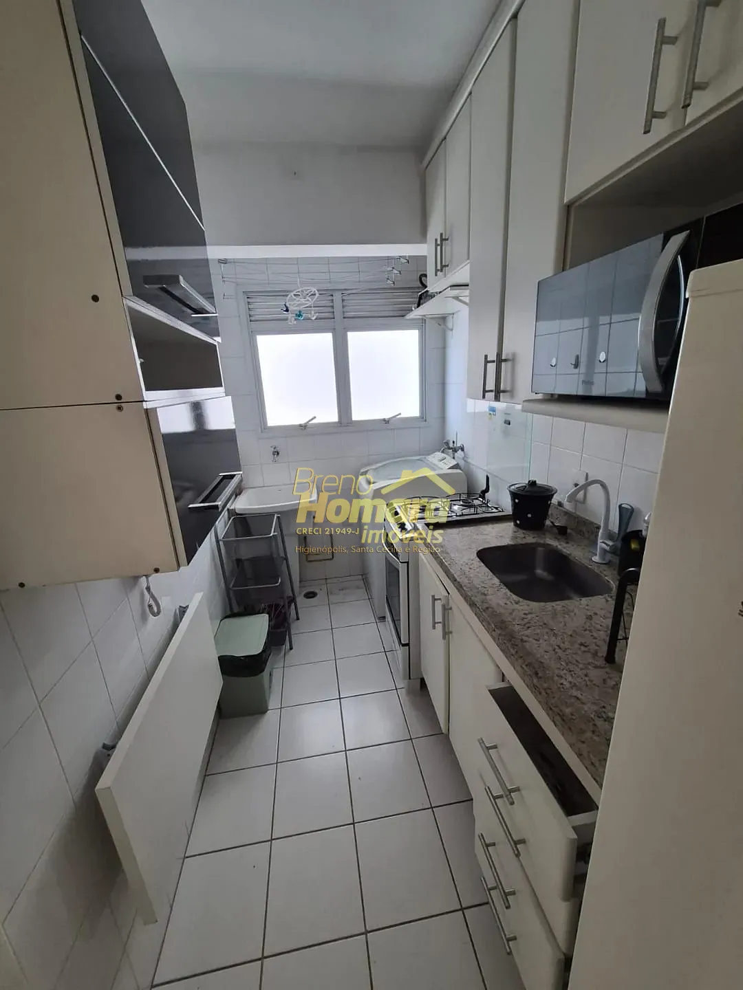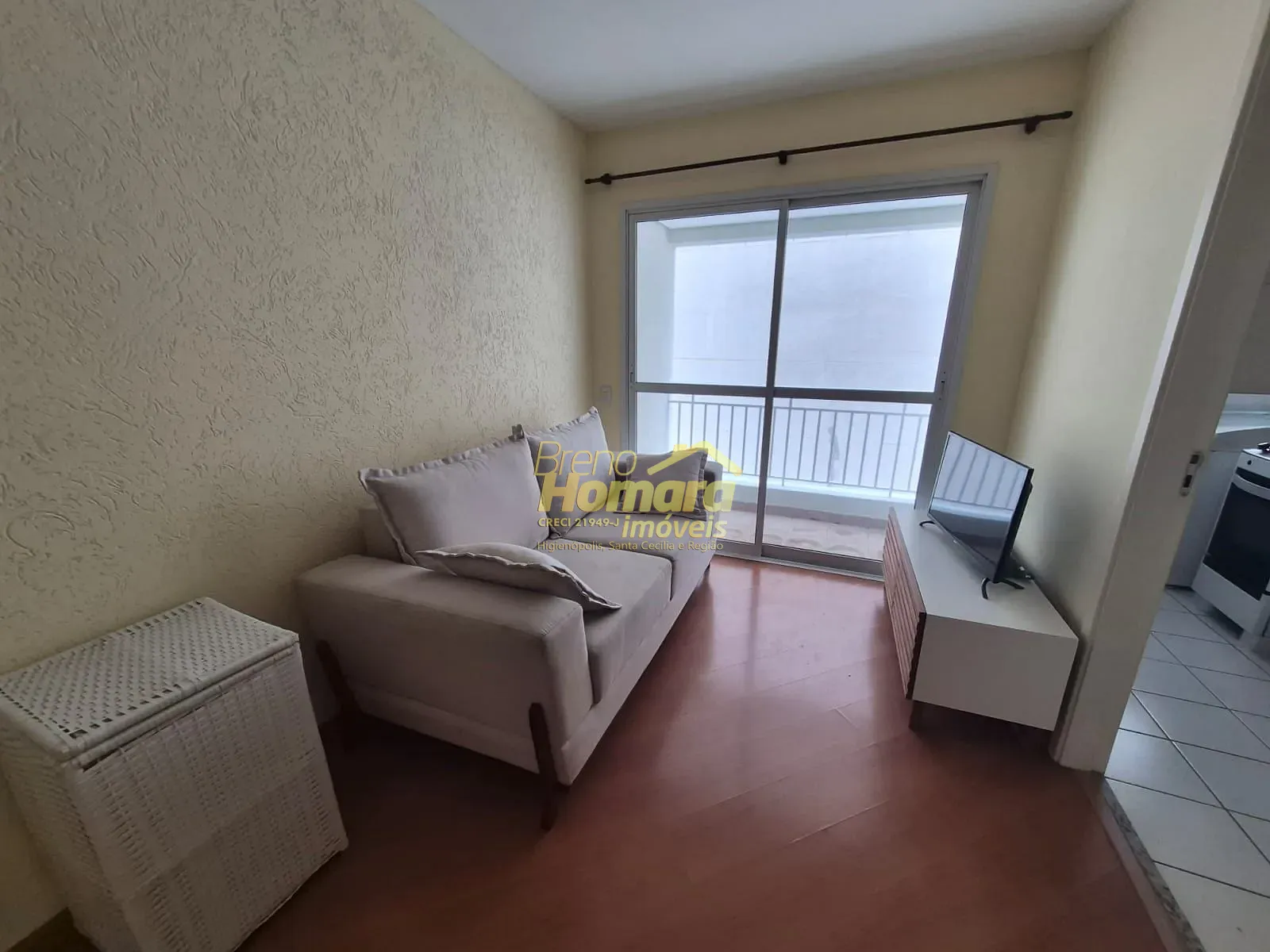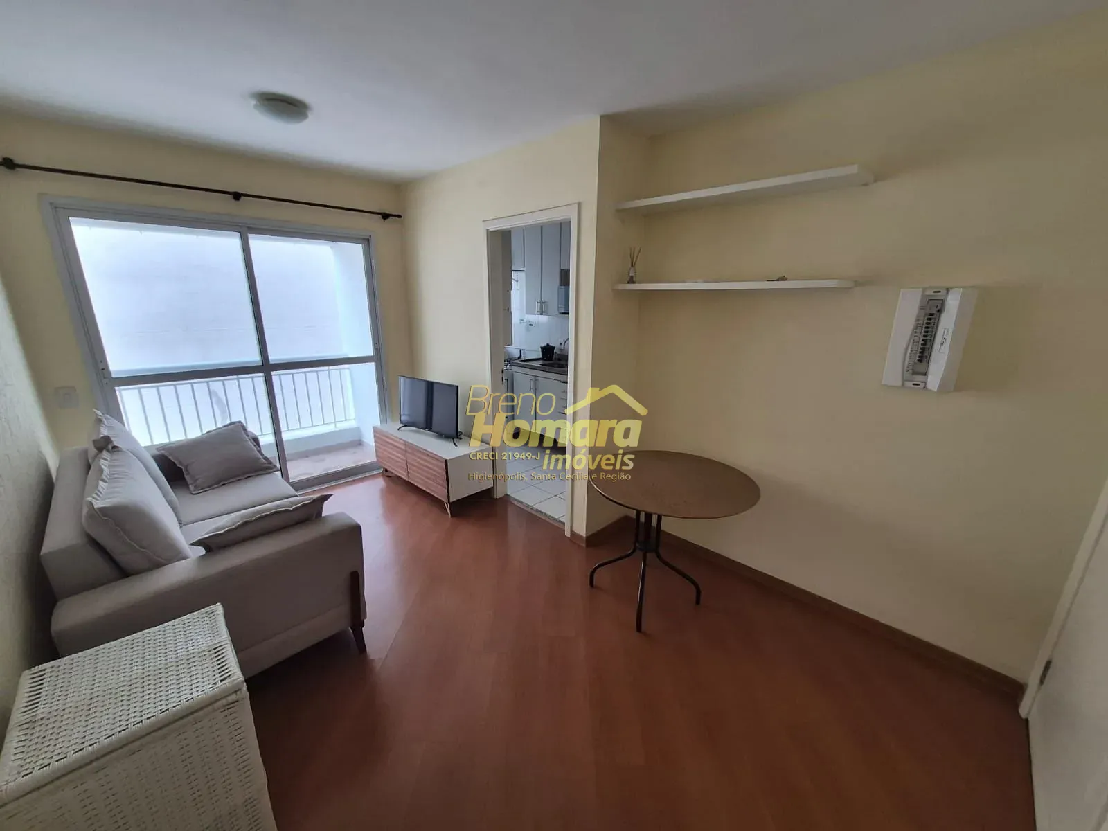 Apartamento mobiliado com sala com sacada, cozinha com armários, dormitório com armários, e vaga de garagem. Prédio oferece portaria 24 horas, piscina, mini mercado, academia, salão de festa, churrasqueira coberta.